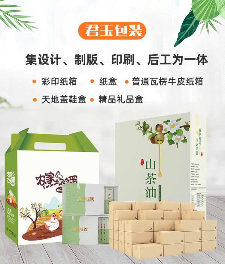 武陟縣君玉包裝有限公司是一家集設(shè)計(jì)、制版、印刷、后工為一體的紙制品生產(chǎn)企業(yè),產(chǎn)品主要分類:彩印紙箱、紙盒、普通瓦楞牛皮紙箱、天地蓋鞋盒、精品禮品盒等紙制品包裝。